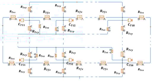 The thermal equivalent circuit implemented in Simulink/Simscape for the copper plate is shown in Figure 8. The serial connection between the resistors of the volume elements allows for a reduction in the number of components in the circuit. The equivalent resistances and (5) are the serial sum of two adjacent resistors in the x- and y-axis, respectively. Likewise, in Figure 8, , , and given by (6) are the serial sum of the resistances to heat transfer by convection and conduction in the three-dimensional space, which is perpendicular to each of the environment contact surfaces. Finally, the thermal capacitances of the volume elements serve as a spatial reference. In Figure 8, the equivalent circuit nodes of each volume element can be used as measuring points of the temperature on the metal plate.