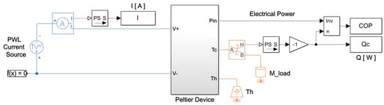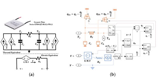 The Peltier equivalent circuit is implemented in Simulink/Simscape using discrete thermal and electrical components as shown in Figure 9b. The heat flow sources in the Peltier device are modelled with two dependent heat flow sources and . These sources integrate both Joule and Peltier effects. The electrical and thermal input/output ports are depicted as and . The heat capacity of and was calculated by equivalent thermal capacitance taken from the study in Refs. [30,35], and the mass m of the device from the datasheets [36]. Likewise, according to [30], the Seebeck coefficient , the electrical resistor , and the thermal can be calculated using the manufacturer’s specifications [36] by substituting this device’s specifications into the equations below (10).