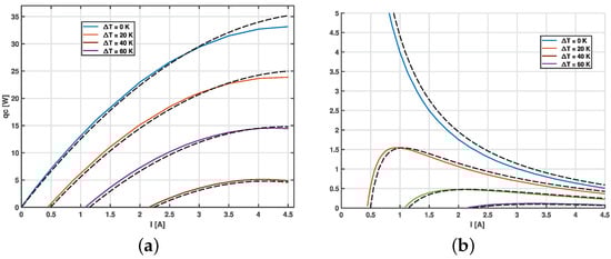 DC Sweep obtains the Peltier response with the hot side temperature set to 300 K, which is shown in Figure 11a,b where and are the output characteristics of Peltier that were obtained by setting the initial temperature of the thermal load according to the temperature difference. It means that if the temperature difference is 60 K, the initial temperature of the load is set at 240 K. Otherwise, if the temperature difference is 30 K, the initial temperature of the load is set at 270 K, etc. This specification provides the initial temperature required for DC Sweep and ensures a better match with the performance of the datasheet.