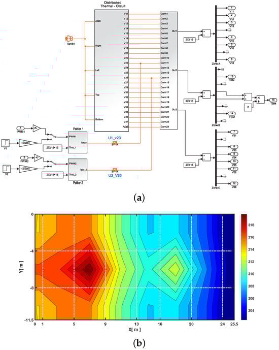 Thus, the fully assembled digital twin of the system is presented in Figure 13a. As can be observed, it is based on the thermal plate (distributed thermal circuit block) and the Peltier thermoelectric models (Peltier1 and Peltier 2 controller by a PWM input signal for each cell) provided in the previous sections.