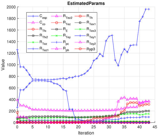 For the proposed multivariable uniformity temperature application, several parameters influence the digital twin response matching, such as thermal resistances (conduction and convection) , , , specific heats , or thermal masses , which are defined in the previous section and can be grouped as , . Although these parameters can be calculated from the material’s thermal properties and the volume element’s physical distribution, these values will differ from the physical system. Thus, the behavioral matching can help to find the values corresponding to the physical system to match the response. The Simulink Design Optimization (SLDO) Toolbox [37] is used as an optimization tool to find the values of . The initial values of are set as shown in Table 4. Non-linear least squares is used as an optimization method with an error tolerance of as stopping criteria.