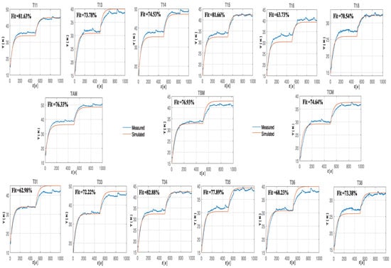 The behavioral matching results using the SLDO are shown in Figure 14 and in the fourth column of Table 4. It uses the input/output data shown in Figure 6 with 50% and 75% duty cycles for both Peltier heating elements for 500 s each. Each parameter is constrained based on its physical limitations. Likewise, the response of the digital twin against the physical asset is shown in Figure 15. For the 12 heating zones evaluated, it can be observed that the simulated response provided by the digital twin provides an accurate representation of the thermal plate temperature distribution. Although there are some cases like T16 or T31 where there is a small mismatching on some of the steady states, the transient response of the digital twin corresponds to the system’s physical behavior.