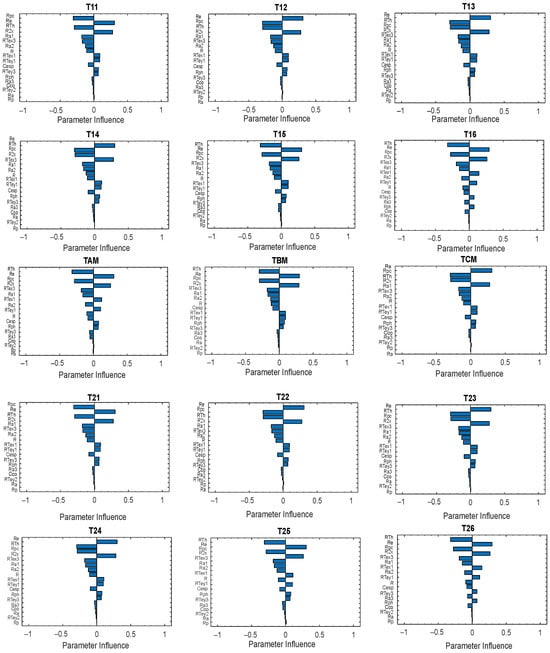 Digital twin sensitivity analysis. The tornado diagram shows that the thermal and electrical resistances , , and have the greater influence over the system’s response and adjustment.