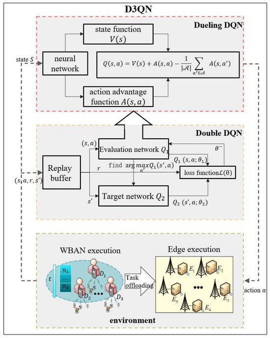 Due to the advantages of control decision-making and resource optimization, deep reinforcement learning (DRL) is widely considered to be an ideal tool for solving policy control problems in complex dynamic environments [15]. A joint optimization offloading and migration algorithm based on asynchronous dominance Actor Critical (A3C) was proposed in [16] to solve the migration and offloading problems in mobile edge computing systems in the context of WBANs. Zhang et al. [17] considered a task-offloading and time allocation algorithm called DNN-TOTA, which is based on deep learning and uses deep neural networks and order-preserving quantization (OPQ) methods to generate candidate offloading decision sets to solve the problems of limited energy resources and low computing power of micro sensor nodes in WBAN. In [18], a deep reinforcement learning-based frame aggregation and task-offloading approach (DQN-FATOA) were used to improve the throughput and overall utilization of the WBAN. Inspired by the above research work, this study designed a task-offloading strategy for MEC based on D3QN quality of experience (QoE) in the context of the WBAN to meet users’ needs for low-cost and data protection. The specific research is as follows:
