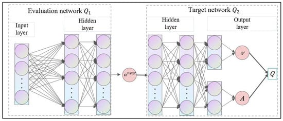 Among them are the parameters of the neural network, while are the parameters for maintaining stable Q values and stable training process of the target DQN. According to Equation (22), DQN updates its network parameters by minimizing .