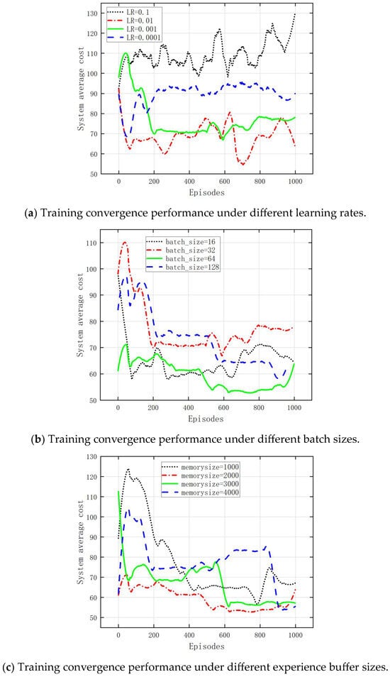 This section demonstrates the convergence performance of our work, where we applied different values to each hyperparameter and selected appropriate values for our simulation. Here, we choose the system average cost for the evaluation metric according to Equation (17).