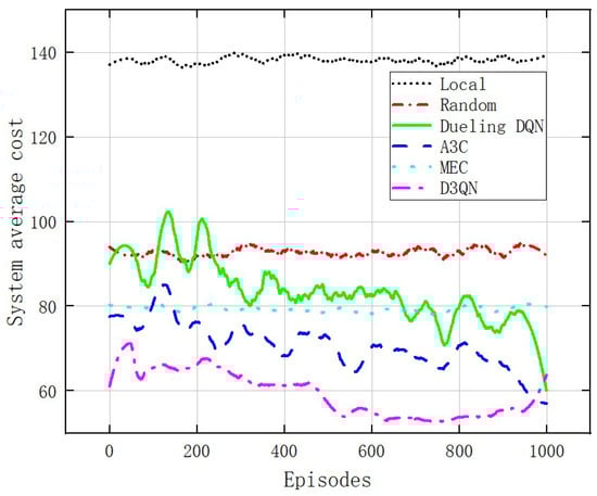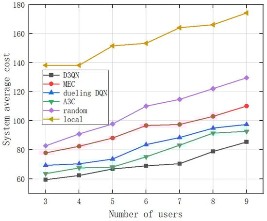 The relationship between the system average cost and the number of WBAN devices is shown in Figure 12. From the graph, it can be seen that the proposed model has an overall cost advantage over other models and can achieve near-optimal execution of the model. Specifically, in Figure 12, this gap is rapidly increasing as the number of WBAN devices increases. In addition, our proposed model based on D3QN is closer to the optimal solution than the execution based on DRL. When the number of users exceeds nine, this advantage will be maintained. This is due to the insufficient computing power of edge servers to address WBAN devices simultaneously.