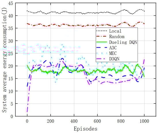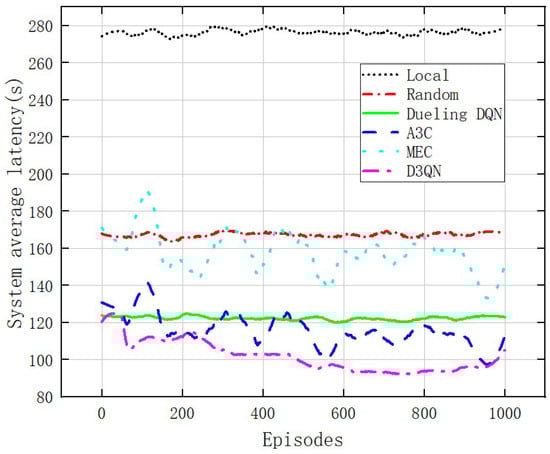 Figure 7 compares the relationship between the average system cost and training frequency of six different offloading model systems with a fixed WBAN of three devices and seven edge servers with a cost weight of 0.5. The system average cost of local execution remains stable at a high level and consistently higher than the other five offloading models. The system average cost for random offloading remains stable at around 90. The system average cost for “MEC” remains stable at around 80. The average user costs of “A3C offloading execution” and “Dueling DQN offloading execution” fluctuate within the range (60,120), but the variance of the latter is smaller than the former. For the “D3QN offloading execution”, the agent is in the exploration stage before 50 training sessions, and the system average cost for users is relatively high; in 50–600 training sessions, the agent quickly learns the optimal offloading scheme, and the system average cost decreases rapidly as the network parameters are updated; after 600 training sessions, convergence was achieved, and the system average cost was significantly lower than the other five offloading models. Compared to the “Dueling DQN” model, the system average cost has been reduced by 31.25%. Figure 8 and Figure 9 show the relationship between the total latency and energy consumption of six different offloading model systems and the number of training episodes. Figure 8 clearly shows that the D3QN offloading model performs better than the other five offloading models in system average latency. As shown in Figure 9, the D3QN offloading model execution results in a more stable and lower system average energy consumption compared to the other five offloading models.