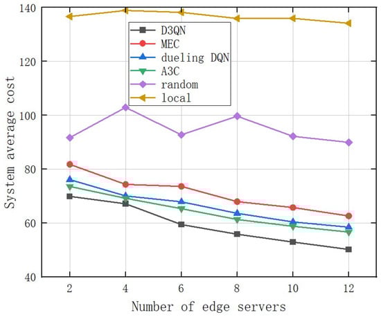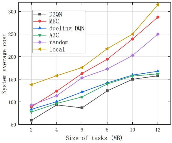 Figure 10 shows the comparison of the system average cost for different offloading models under different task sizes with a fixed number of three WBAN devices and seven edge servers with a cost weight of 0.5. The values of tasks in the experiments are, respectively, set to ranges 1.5–2 MB, 3.5–4 MB, 5.5–6 MB, 7.5–8 MB, 9.5–10 MB, and 11.5–12 MB. In Figure 10, they are represented by 2 MB, 4 MB, 6 MB, 8 MB, 10 MB, and 12 MB, respectively. The system average cost of the model proposed in this article and the comparison model increases with the increase of task data size. The system average cost of the “D3QN offloading model execution” is the lowest, while the system average cost of the “local execution” model is the highest. When the number of users is fixed, and the task size is 2 MB, the difference in system average cost between the D3QN offloading model and other models is small. However, as the size of task data increases, the advantage gradually expands. As the task data size is 4 MB, the system average cost performance of the A3C and dueling DQN offloading model is similar to that of the D3QN offloading model. Due to the intelligent agent’s ability to adaptively adjust its offloading strategy, the performance advantage of the A3C and dueling DQN offloading model is reflected when the task data size increases to 12 MB. However, it is still worse compared to the D3QN offloading model. The above results further indicate that D3QN is more effective in reducing the system average cost when the task data size is large.