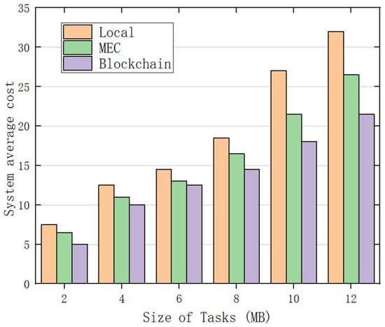 Comparison of the system average costs of local, edge, and blockchain under different task sizes.