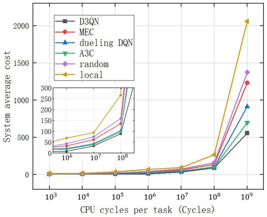 Comparison of the system average cost under the number of CPU cycles required for different tasks.