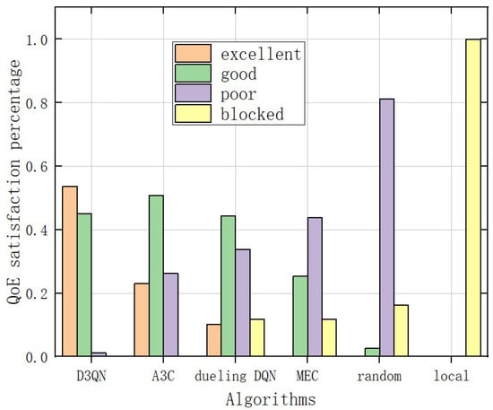 In Figure 15, we tested the quality of experience of 1000 users. Among them, 53.7% of users in the D3QN model have excellent QoE; 45.1% of users have good QoE; and 0.12% of users have poor QoE. It can be seen that the user QoE of the D3QN model is significantly higher than the other five models. In addition, the proportion of blocked users obtained by the D3QN model is 0%, while the benchmark is 10%. This is because, in the D3QN model, the user’s task is offloaded to the lowest latency computing node. Meanwhile, the “D3QN model” allows agents to offload tasks within to any computing nodes within the range based on QoE to provide the highest quality.