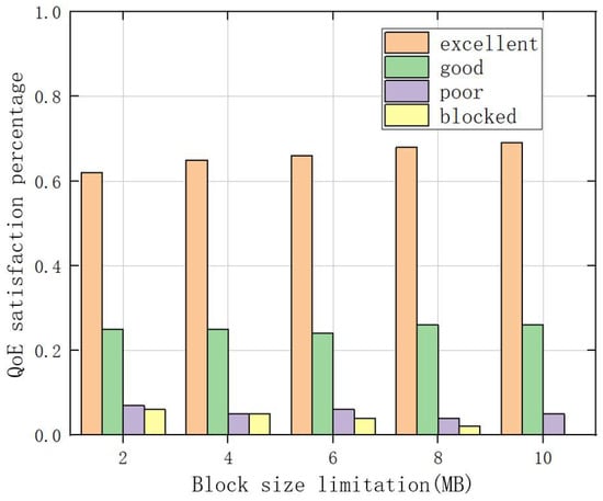As an important component of the solution, the impact of blockchain systems on the performance of the solution cannot be ignored. In Figure 16, we discussed the comparison of user QoE with different block size restrictions in the D3QN model. The figure shows that users can gain more and better QoE as the block size increases. However, due to the constraints of the blockchain system, it cannot increase infinitely. Obviously, through the training of the D3QN model, more user data in this scheme have the opportunity to select and upload blockchain systems, ensuring data security.