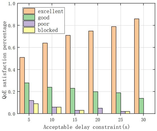 Figure 17 compares the QoE satisfaction of users with different acceptable delays in the D3QN model. From the graph, it can be seen that as the acceptable delay increases, the proportion of satisfied users significantly increases, indicating a significant increase in the quality of user experience. The reason is that as acceptable latency increases, there is more time to decide and choose the appropriate computing server and blockchain cache. Due to the addition of training through D3QN, the D3QN model can still maintain a lower system average cost under all acceptable delay constraints.