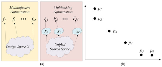 Multiobjective and multitasking optimization. (a) The search space in multiobjective and multitasking optimization. (b) Objective space in multiobjective and multitasking optimization. The best solutions for multiobjective optimization are and the best solutions for multitasking optimization are .