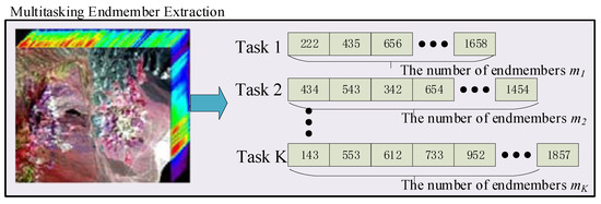 In this paper, is a solution vector containing a extracted endmember subset. is the position of the pixel in the hyperspectral images. For the k task, as shown in Figure 3, the number of endmembers is m and the positions of these m endmembers are recorded in . It can be observed that the K endmember extraction tasks have different numbers of decision variables. It is necessary to search these solutions to different endmember extraction tasks in a unified search space . is defined as