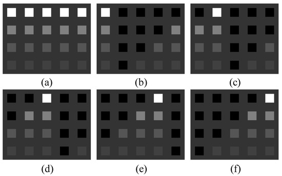 In this experiment, we created a simulated hyperspectral image of 80 × 100 pixels covering 224 bands using a subset of five endmembers from the USGS spectral collection. The middle of the scene seen in Figure 4a is where the twenty synthetic pictures were placed in a 4 × 5 matrix. The first row was made entirely of pixel panels, whereas mixes of two to four endmembers were used to make the last three rows. A mixture of 20% of each of the five mineral fingerprints was used to replicate the background [42]. The genuine fractional abundances for each of the five endmembers are displayed in Figure 4b–f. The five signatures, Alunite AL706 (A), Buddingtonite GDS85 (B), Calcite CO2004 (C), Kaolinite CM3 (K), and Muscovite GDS107, were selected from the USGS library, as Figure 5 illustrates.