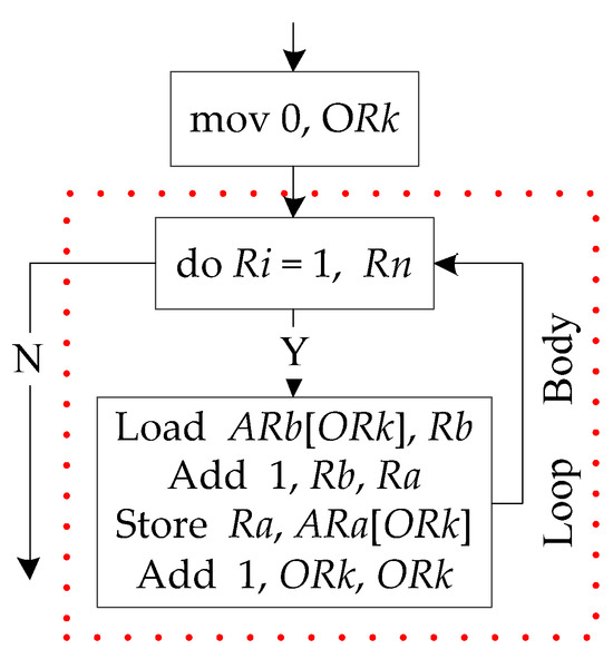 The arithmetic logic of the two loops shown in Listing 1 and Listing 2 is to take out each element of ARa in turn, add 1, and put them into ARb. The induction variables identified in the conventional loop unrolling approach are different depending on the different forms of a loop. The induction variables of the loop in Listing 1 are Ri and Ork. And the induction variables of the loop in Listing 2 can be identified as Ri, Ara, and ARb.