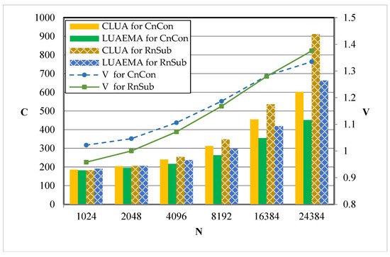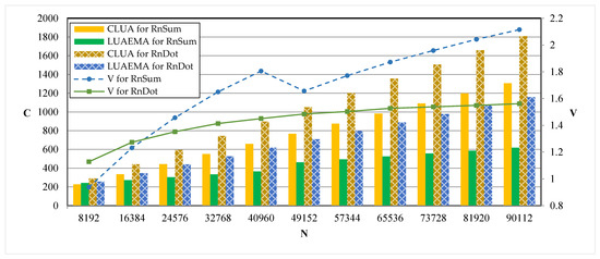 The input vector intermediate code of the algorithm is the same for both the conventional loop unrolling approach and the LUAEMA. For each algorithm, we consider several data volumes and obtain corresponding timing cycles by experiment. We use C, N, and V to represent the timing cycle, data volume, and speedup ratio, respectively. The results are shown in Figure 6 and Figure 7, where CLUA means that the corresponding values are obtained under the conventional loop unrolling approach, CnCon refers to the complex data conjugation algorithm, RnSub refers to the real data subtraction algorithm, RnSum refers to the real data summation algorithm, and RnDot refers to the real data dot product algorithm.