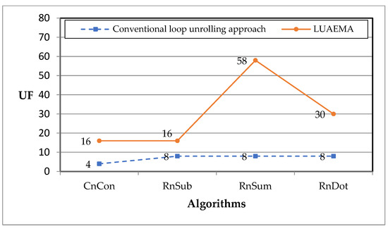 The comparison of UFs after processing four algorithms using two loop unrolling approaches.