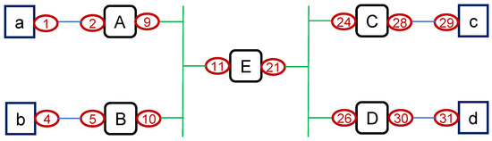 Condition 1—Subnetwork Accuracy: Given a loop-free path trace, two or more IP addresses from the same subnetwork cannot appear in any path trace without having a successor/predecessor relationship with each other. That is, IP addresses in a subnetwork (or their aliases) should appear consecutively if they appear in the same trace. For instance, consider the sample topology in Figure 2, where a⋯d are end-hosts and A⋯E are routers. Without the knowledge of network topology, a path trace from a to b, i.e., (2, 10, 4), will indicate that interface IPs 2 and 4 cannot be in the same subnetwork. as they are two hops away of each other in a trace. While RFC 1812 states that ICMP error messages should be sent with the IP address of the outgoing interface toward the vantage point, another interface’s IP might be returned. This practice could yield path traces with two IP addresses of the same subnetwork appear consequently, such as interfaces 9 and 10, if router A was to reply with IP address of 9 instead of the expected IP of 2. Hence, the accuracy condition allows a subnetwork with IP addresses that appear consecutively in a trace but not farther apart.