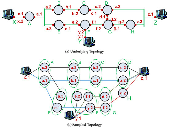 As routers have multiple interfaces, each interface typically has a unique IP address. Note that an interface could borrow another interface’s IP address through an IP unnumbered mechanism [46]. Additionally, a globally unique loopback address might be assigned to the router using a /32 subnet [47]. In a given set of path traces, a router may appear on numerous path traces with different IP addresses. Therefore, there is a need to identify and group IP addresses belonging to the same router, denoted with ≡. Without the IP alias resolution, the resulting network graph may be significantly different from the underlying topology [20]. For instance, in Figure 3a, each router has multiple interfaces with unique IP addresses. Collecting traces between all pairs of X, Y, and Z end systems, we would obtain a sampled topology as in Figure 3b without the alias IP resolution. We need to identify IP aliases for each router and cluster them as shown with the green circles. Several studies pointed out the impact of incomplete IP alias resolution in certain measurement studies [20,48]. Varying the resolution success rate, we showed that the IP alias resolution process has a significant impact on the observed topological characteristics [20].