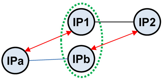 As pointed out in the Kapar enhancement [32], original APAR implementation had high storage requirements. In this study, we modified the neighbor matching to focus on neighboring subnets, as shown in Figure 4. The red arrows indicate a subnetwork relation between IP addresses from two different path segments of (IP1, IP2) and (IPb, IPa), and the green circle indicates the alias IPs. In the proposed modification, we identify IP aliases that are between two subnets without requiring to record the triplets as in [32]. We also included additional sanity checks as indicated below, where a subset of the modes is selected based on the sampled network topology characteristics.