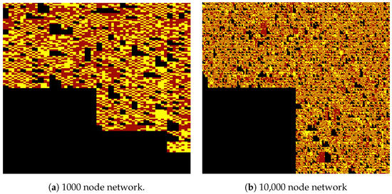 We obtain synthetic networks that contain subnetworks and routers with multiple interfaces using the Subnetwork Oriented NETwork (SONET) topology generator [50,51]. The IP distribution for the 1000 and 10,000 node networks are provided in Figure 5 using a Hilbert curve plot. The yellow marks are the IPs assigned, the red marks are the IP space left empty while increasing the mask of the subnet needed, and the black marks are the unassigned IPs.