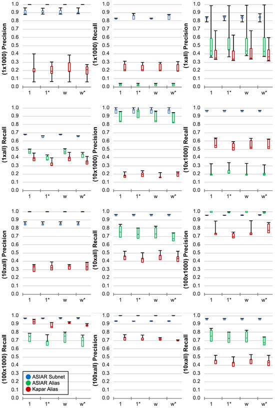 Figure 6 presents the ASIAR subnetwork and IP alias resolution performance results along with the Kapar IP alias resolution for five networks of 1000 nodes. Each subfigure presents the precision alongside the recall of networks with a given number of sources and destinations. In the figures, the x-axis presents the precision and recall values. Furthermore, the y-axis indicates the synthetic network characteristic, where 1 is for the unit network, 1* is for the unit network with unresponsive routers, w is for the weighted network, and w* is for the weighted network with unresponsive routers. Each box plot shows the five-number summary statistics of (min, first quartile, median, third quartile, and max), where a narrower band indicates a more consistent result. Note that while there are 1000 router nodes, they contain approximately 1900 interfaces, each with a unique IP address. We generated network samples with unit edge weights where all path traces are the shortest paths and weighted edges where some of the paths are not the shortest. We also considered when about 12% of routers were set as unresponsive, i.e., their IP addresses were hidden, based on the measurements of [53].