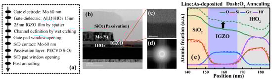 The transmission electron microscope (TEM) image was obtained by using a focused ion beam (FIB) to cut the cross-section of the device along the channel length direction, as shown in Figure 1b, where each layer of device structure can be clearly observed. Figure 1c shows high-resolution transmission electron microscopy (HRTEM) image, and the relatively clear and sharp interface on the IGZO/HfO2 film indicates good film quality. Figure 1d shows the fast Fourier transform (FFT), which exhibits typical diffuse ring characteristics, indicating that IGZO is amorphous. The elemental composition of IGZO TFT was analyzed using an energy dispersive spectrometer (EDS), as shown in Figure 1e. After O2 annealing, the elemental densities of Si, Ga, and Hf remained basically unchanged, but the O concentration in the a-IGZO channel increased, indicating oxygen permeation and possible filling of oxygen vacancies during the O2 treatment process, which helps to improve the quality of the IGZO thin film.