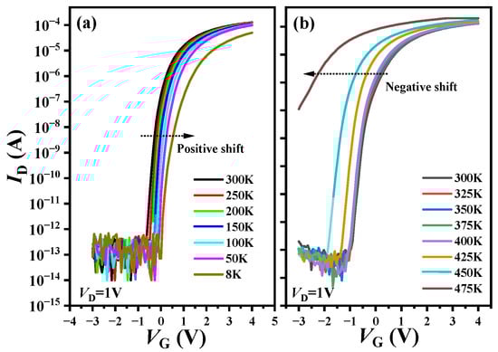 (a) The relationship between the ID–VG curve and low-temperature changes. The curve shifts in a positive direction with the temperature decreases. (b) The relationship between the ID–VG curve and high-temperature changes. The curve shifts in a negative direction with the temperature increases.