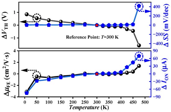 Key parameters that characterize the electrical performance of IGZO TFT are extracted according to the ID–VG curves at various temperatures in Figure 2, including ΔVTH, ΔSS, ΔμFE, and ΔION. The variation of each parameter with temperature is shown in Figure 3. These parameters are all based on 300 K as a reference point. Taking ΔVTH as an example, ΔVTH represents the difference between the threshold voltage at a specific temperature and the threshold at room temperature, as shown in Equation (4).