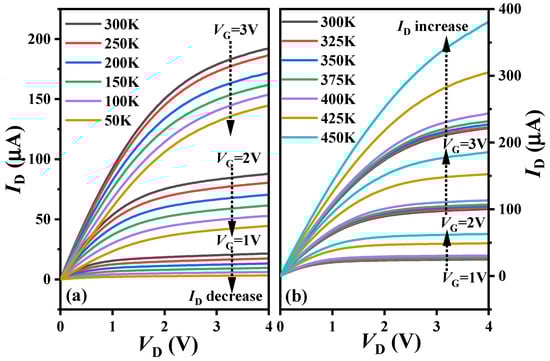 The relationship between the ID–VD curves and temperature of a-IGZO TFT is shown in Figure 4. In the low-temperature range, the ID decreases with decreasing temperature; in the high-temperature range, the ID increases with increasing temperature.