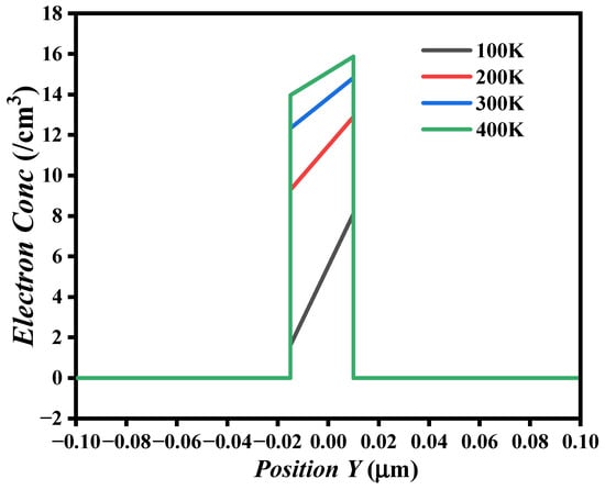 The variation relationship between a-IGZO TFT devices and temperature was simulated using TCAD. Specifically, the a-IGZO mobility model related to lattice temperature was used to simulate the changes in device electrical characteristics with temperature. The mobility model was designed to work in conjunction with the defect density model of electronic states [29]. Physical models such as the IGZO.TOKYO temperature model, Shockley–Read–Hall (SRH) generation and recombination, and Fermi statistical model were used in the simulation process [30]. The ID–VD curve obtained from TCAD simulation showed a consistent trend with the experimental test results as a function of temperature. Figure 5 shows the variation curve of channel electron concentration with temperature in TCAD simulation. As the temperature increases, the channel electron concentration significantly increases.