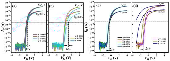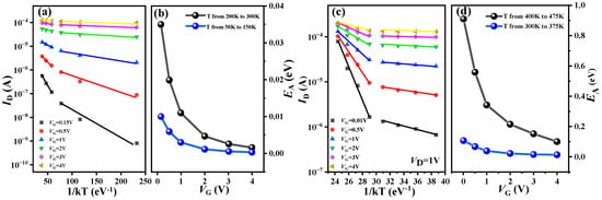 Figure 6a,c show the linear temperature dependence of the logarithm of ID and 1/kT under different VG voltages at low and high temperatures, respectively, and satisfies the Arrhenius relationship. The relationship between drain current and temperature is described by the Arrhenius Equation (5) [31,32].