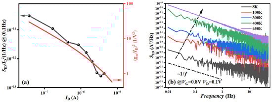 In order to analyze the effect of temperature on the charge transfer mechanism of IGZO TFT, the noise characteristics of the device at different temperatures were studied. At room temperature, the normalized drain current noise spectral density (SID/ID2) and the transconductance to drain current squared (gm/ID)2 of IGZO TFT exhibited an approximate trend of variation with drain current, as shown in Figure 8a. Among them, the SID/ID2 was extracted at ƒ = 0.1 Hz for the device. This indicates that the noise spectral density and transconductance of IGZO TFT satisfy the carrier number fluctuation (CNF) theory shown in Equations (7) and (8) [3,39].