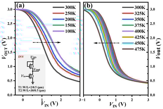 The inverter circuit was designed based on the IGZO TFT device, as shown in Figure 9. The transistor T1 with gate drain short circuit is used as the load transistor, T2 is the driving transistor, and the aspect ratios of T1 and T2 are 2/0.5 (μm) and 30/0.5 (μm), respectively. The purpose of using a large-sized T2 is to provide sufficient driving capacity for the inverter to increase output swing. The voltage transmission characteristic (VTC) curve of the inverter was tested at different temperatures and is shown in Figure 8, where the power supply voltage VDD = 3 V. In low-temperature environments, the VTC curve shifts to the right as the temperature decreases; in a high-temperature environment, the VTC curve moves horizontally to the left with the temperature increases. This is consistent with the trends of the ID–VG curves of IGZO TFT in Figure 2a,b under low- and high-temperature environments, respectively. This is reasonable because compared to the output drain current of a single transistor, the presence of load transistor T1 in the inverter converts the drain current of transistor T2 into output voltage.