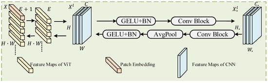To ensure the alignment of spatial dimensions between the feature map in the CNN branch and the patch embedding in the Transformer branch, an upsampling operation is performed on the CNN feature map . The feature map is then adjusted to channels using a 14 × 1 convolution to obtain . Finally, the upsampled feature map is added to F as .