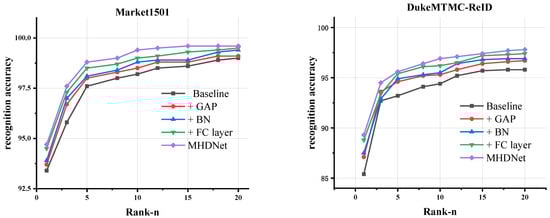Table 6 shows that our MHDNet achieved 87.7% mAP and 94.6% Rank-1 on the Market-1501 [46]. Its Rank-1 accuracy is slightly, 0.8%, lower than PAT and the same as Rank1 accuracy in TransReID, yet MHDNet clearly surpasses all methods in terms of mAP. On the DukeMTMC-ReID [36] dataset, MHDNet achieved the Rank-1 accuracy of 89.1% and the mAP value of 79.7%, respectively, which are higher than most models. However, it still cannot reach the level of some recent excellent models in all indicators. This is because we only improved the model’s performance by modifying the backbone to make it work well on devices with limited performance, while strictly limiting the model’s resource consumption. In contrast, other models do not have this limitation.