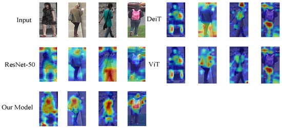 It is evident from the first and second rows on the left side of the attached image that ResNet-50 struggles in handling regional features, whereas MHDNet demonstrates profound attention to such features, excelling not only in balance but also in notable multi-scale attention capabilities. In contrast, the first and second rows on the right side reveal that while the traditional ViT structure model can, to a certain extent, focus on regional features, it falls short in extracting these features with precision. MHDNet achieves remarkable balance between local and global information, enabling accurate separation of individuals from their surroundings. These characteristics fully demonstrate that the use of MHDNet in person re-identification (ReID) tasks can more effectively capture human body features, enhance recognition accuracy, and better adapt to various environmental and scene processing requirements.