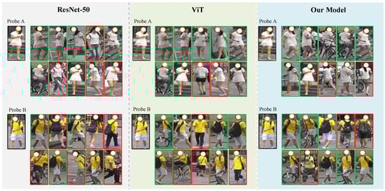 The inference results presented in Figure 6 demonstrate that MHDNet retrieves targets with the same ID rapidly and achieves better matching results than ResNet-50 and ViT models for each query. Furthermore, in complex cases, such as case B, MHDNet can correctly match the target and ignore other possible interfering factors, indicating that it has stronger robustness and accuracy and can perform well even in complex person recognition tasks.