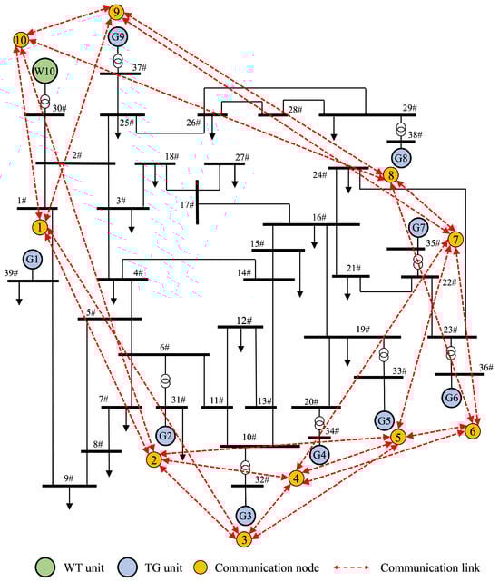 In this section, several case studies are presented in order to illustrate and validate the proposed algorithm. The case studies are simulated in the MATLAB R2021a environment on a laptop with Intel Core i5-7300U CPU @2.60 GHz and 8 GB RAM. The test systems are based on the IEEE 39-bus system, which includes 10 generator units. Generators 1 to 9 are TG units, while Generator 10 is replaced with a WT unit. The communication topology is an undirected network. The entire system including the power network and communication network is shown in Figure 1. The orange nodes represent the communication nodes. The red dashed lines indicate the connectivity between communication nodes.