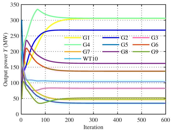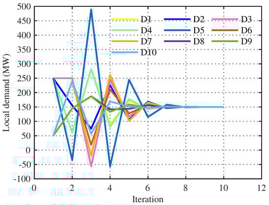 The positive constant is set as . The eigenvalues of the Laplacian matrix can be calculated by the proposed distributed consensus algorithm. From to , the values are 0, 2.1085, 2.4775, 4.4875, 5.0000, 5.3666, 6.0000, 6.3258, 6.8359, and 7.3982. Based on the obtained eigenvalues, the finite-step consensus algorithm is used to calculate . The iteration result of is shown in Figure 2. After 10 iterations, all agents converge to the average value of total load demand, i.e., 150 MW. Similarly, can be obtained by 10 iterations. Then, the optimal value of the Lagrange multiplier for each iteration can be obtained, allowing for the calculation of .
