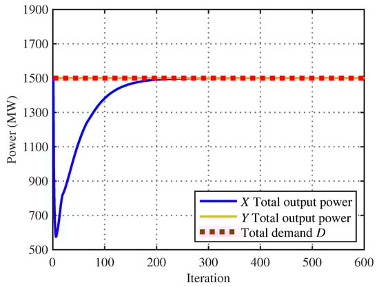 The simulation results of output power X and Y are shown in Figure 3 and Figure 4. It can be seen that the iterative curve of X is smoother and has smaller fluctuations, which is because in the sub-optimization problem, the inequality constraints limit the range of variation. The power supply and demand relationship diagram is shown in Figure 5. It can be seen that after a certain number of iterations, the sum of X is equal to the total load demand value, while the sum of Y is always equal to the total load demand during the iteration calculation process. This is because in the sub-optimization problem, the equality constraint of supply and demand balance restricts the sum of Y. The residual results are shown in Figure 6. The dual residual first converges below the threshold, and after 508 iterations, the primal residual also converges below the threshold. Thus, the results converge to the optimal value.