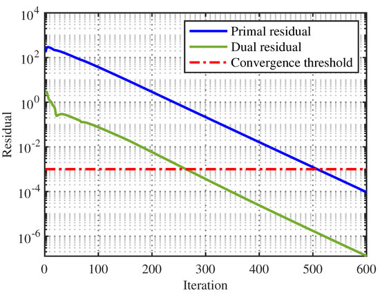 where and are the convergence thresholds for the primal residual and the dual residual, respectively.