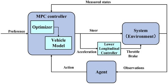 With increasing computing power, sensing, and communication capabilities and advances in the field of machine learning, automating controller design and adaptation based on data collected during operations are being studied [15], such as by improving performance, facilitating deployment, and reducing the need for manual controller tuning. In refs. [16,17,18], Gaussian Process Regression and neural networks were used as predictive models of controlled systems, which were prediction models adaptively adjusted in a data-driven manner to improve control accuracy and reduce computing costs. The concept of using reinforcement learning (RL) to learn MPC cost function parameters is introduced in ref. [19]. Ref. [20] proposes a weights-varying MPC using a deep reinforcement learning (DRL) algorithm to adjust cost function weights in different situations. Ref. [21] proposed a novel approach limiting DRL actions within a safe learning space, and the proposed DRL algorithm can automatically learn context-dependent optimal parameter sets and dynamically adapt for a weights-varying MPC. Ref. [22] has introduced a novel control algorithm based around an event-triggered MPC, using RL with a configurable objective to automatically tune the control algorithm’s meta-parameters: the prediction horizon and the re-computation (triggering) problem. In ref. [23], a RLMPC scheme was introduced integrating MPC and RL through policy iteration (PI), where MPC is a policy generator and the RL technique is employed to evaluate the policy. This RLMPC scheme has great potential in reducing computational burden.