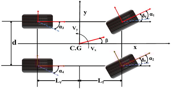 In this paper, the model for lateral movement is constructed on the foundational principles of the bicycle model. This approach presumes symmetry in the steering angles on both the left and right sides, which effectively reduces the complexity of the vehicle’s dynamic model to that of a two-wheeled bicycle. Leveraging Newton’s second law of motion, simplified Equations (1a)–(1c) can be derived to quantify the lateral force exerted by the vehicle.