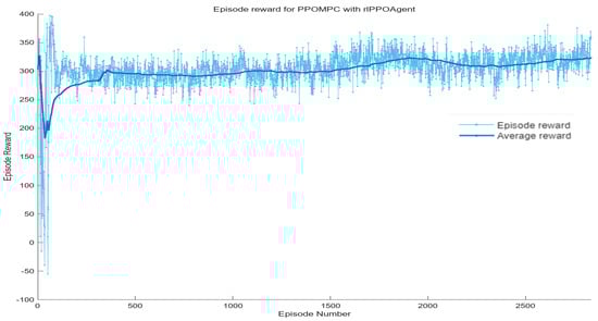 Based on the aforementioned simulation environment, training was conducted for up to 10,000 episodes, with each episode spanning up to 500 steps. Figure 4 depicts the training results. The light blue line represents the cumulative reward obtained by the agent at the end of each round; the thick line describes the average reward value of all rounds during the training process. In the early stages of training, PPO reinforcement learning explores various actions through interactions with the environment to achieve the overall optimal outcome. In this experiment, after 300 rounds, the model finally converged stably, showing good training effects.