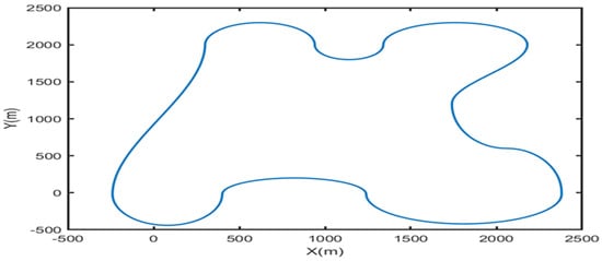 PPO-MPC is simulated and verified at different speeds, and its trajectory tracking performance is analyzed in this section. In addition, PPO-MPC was compared with MPC under fixed prediction horizons at different speeds, and their performance was discussed. The pre-calculated reference path is shown in Figure 5, with a total length of 12,000 m.