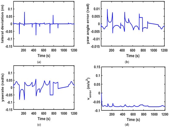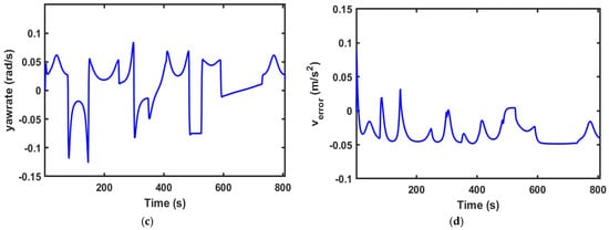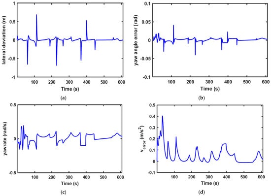 Performance of the PPO-MPC controller at . (a) Lateral deviation. (b) Yaw angle error. (c) Yaw rate. (d) Velocity error.